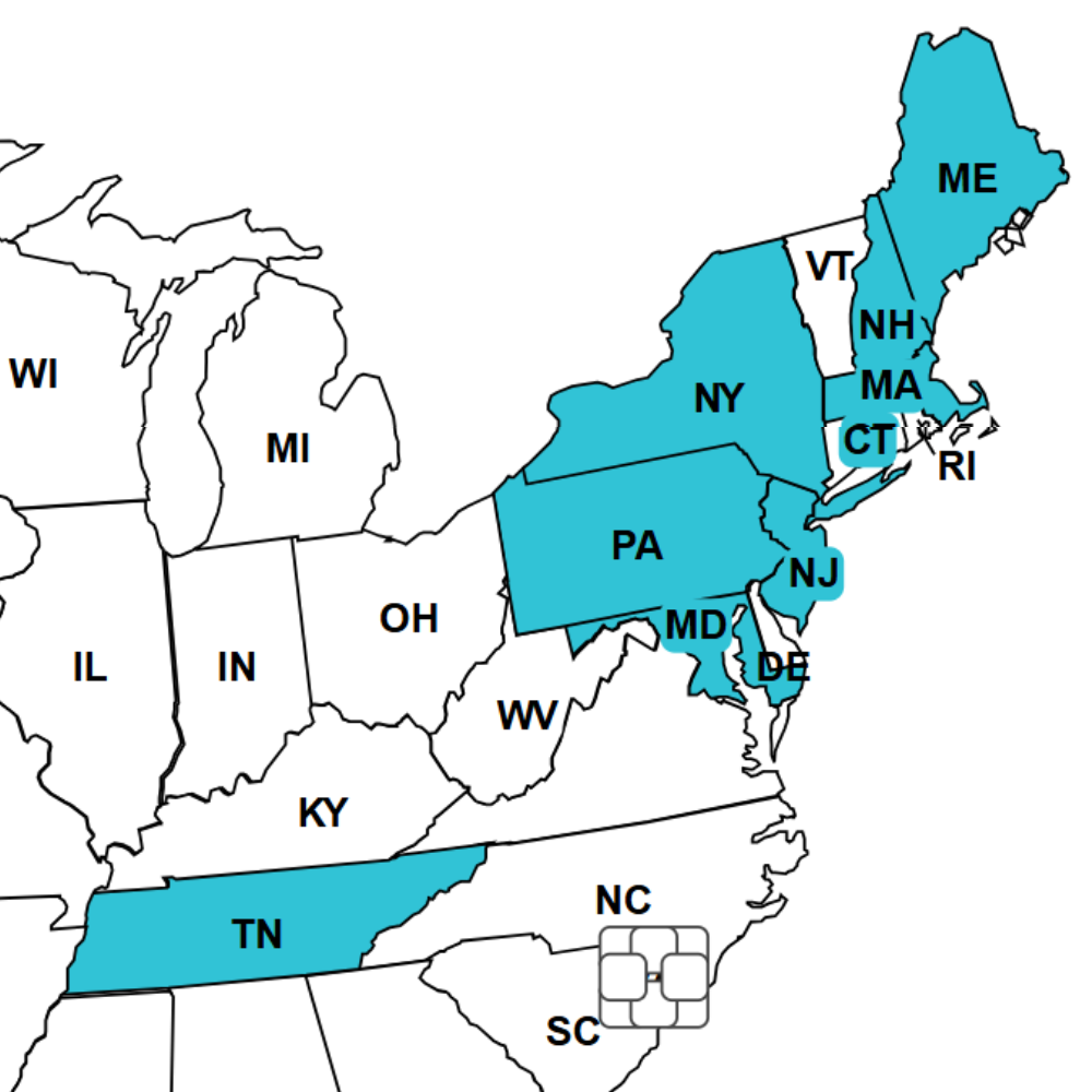 -Pennsylvania -New York -Maryland -Connecticut -Massachusetts -New Hampshire -Maine (Southern Part of the State) -New Jersey (Most of the State) -Tennessee